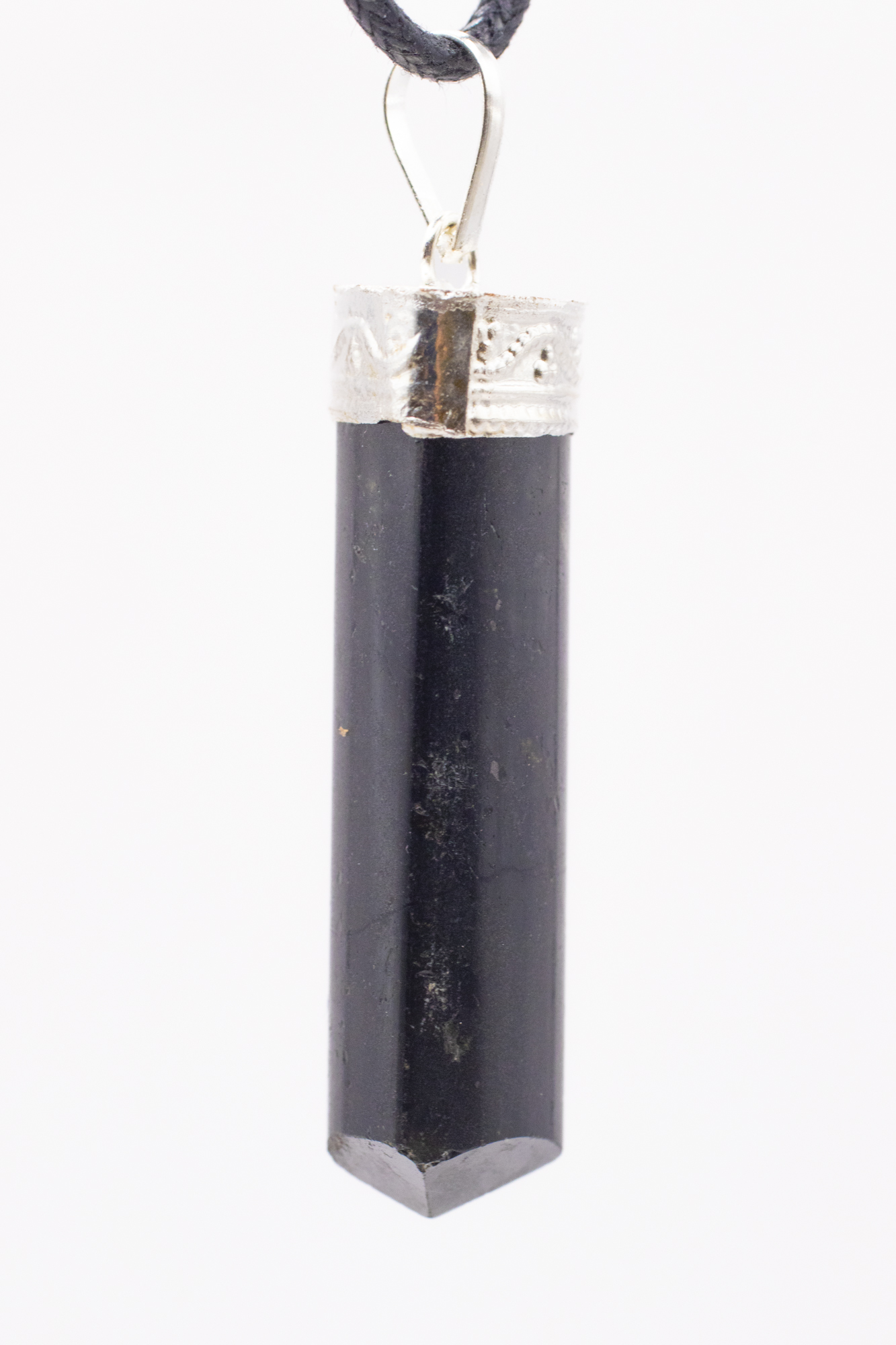A polished black tourmaline pendant with an ornate silver coloured fitting.