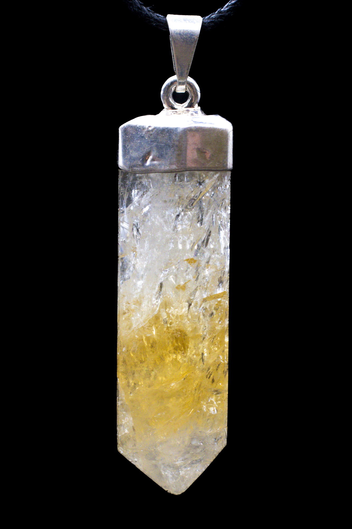 A stunning Brazilian cut and polished citrine capped point pendant with great inclusions. The metal used is hypo allergenic. Approx pendant length 40mm.