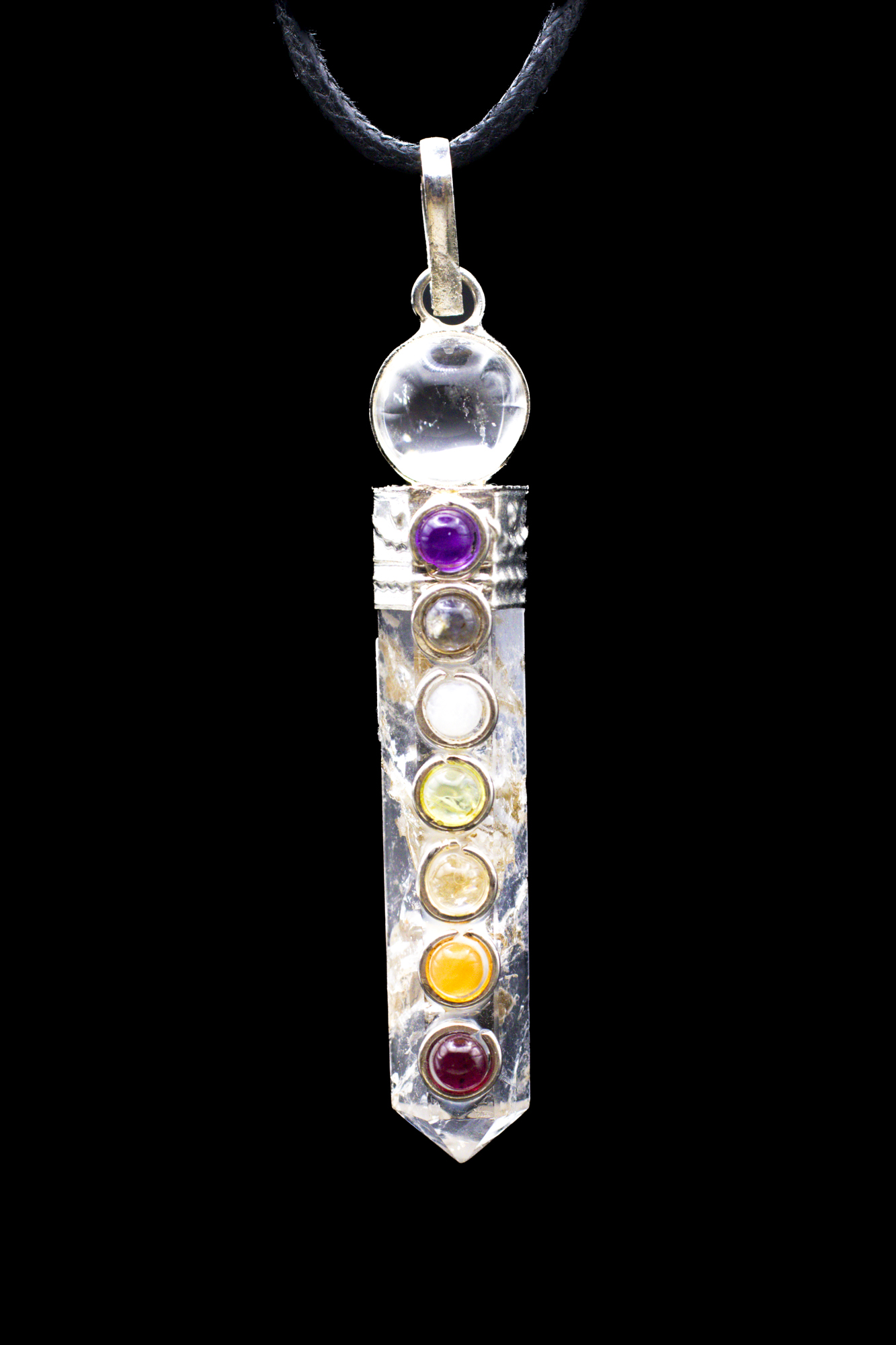 A stunning, Clear Quartz Chakra capped point pendant with the seven stones of the chakra running down the length in cab form. The point has a Clear Quartz ball fixed at the top and a silver plated bale.