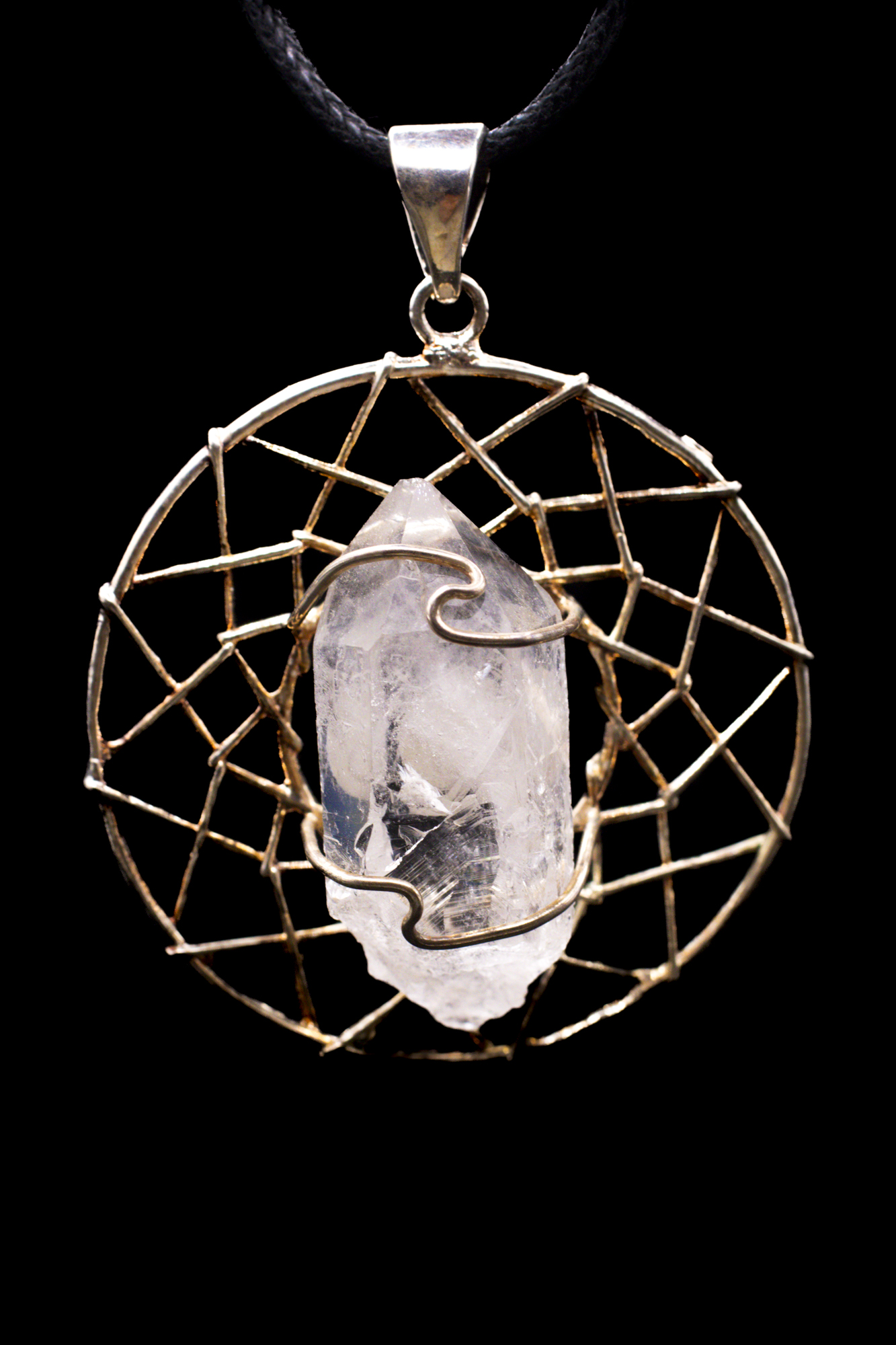A clear quartz point pendant with a wire-wrapped web design, made to look like a dreamcatcher.