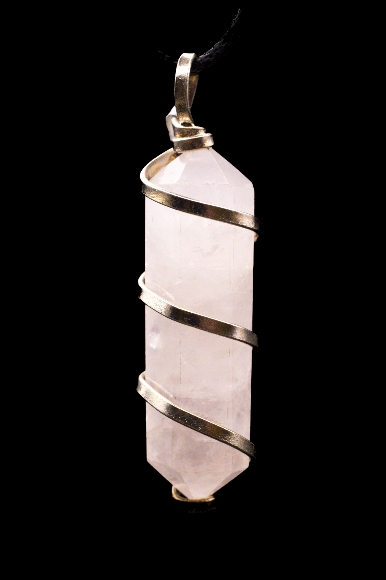 Double Terminated rose quartz spiral pendant with silver plated wiring wrapped around to make a pendant.
